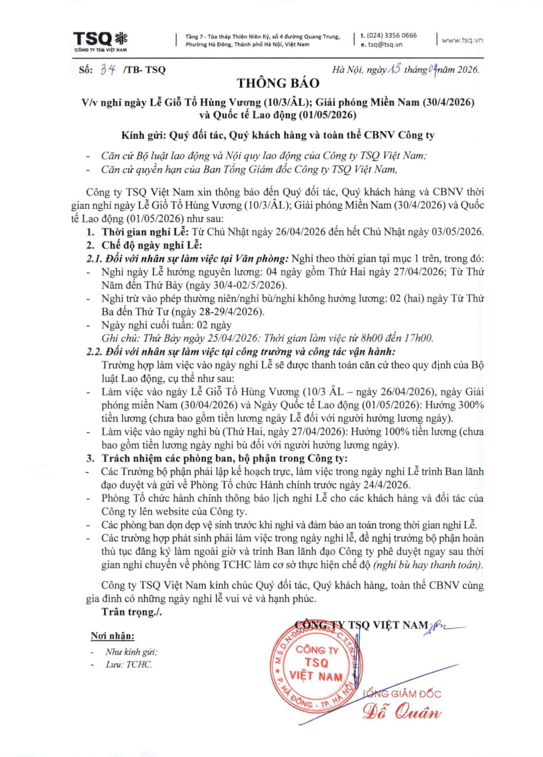 Công ty TSQ Việt Nam trân trọng gửi đến Quý Đối tác, Quý khách hàng và CBCNV Công ty lịch nghỉ Lễ Giỗ Tổ Hùng Vương (10/03 Âm lịch); Ngày Giải Phóng Miền Nam (30/04) và Quốc tế Lao Động (01/05) như sau: Xin trân trọng thông báo! Share This